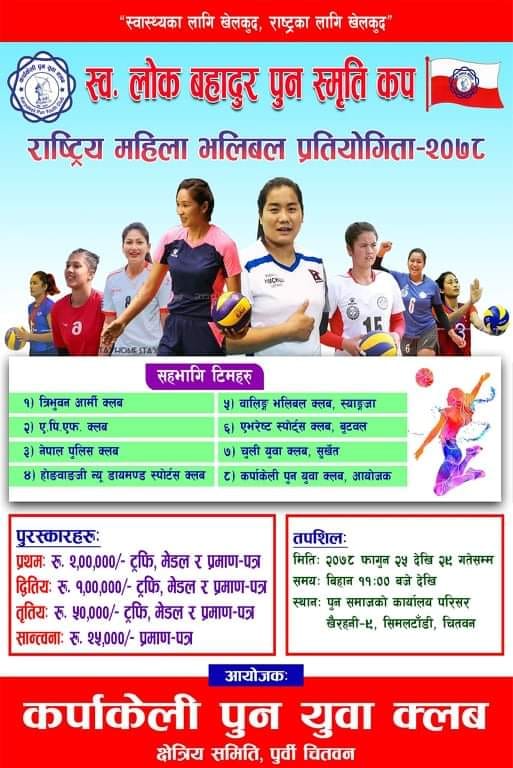 चितवन (हाम्रो खेलकुद) – कर्पाकेली पुन युवा क्लब चितवनको आयोजनमा स्वर्गिय लोक बहादुर पुन स्मृति कप राष्ट्रिय महिला भलिबल प्रतियोगिता यसै महिना आयोजना हुने भएको छ ।