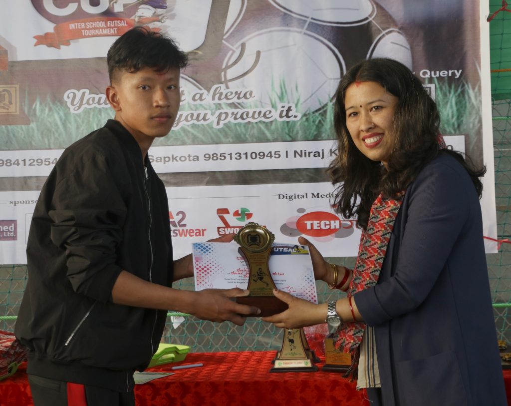 प्रतियोगिताको विजयी टोली तथा खेलाडीलाई न्यु एरा एकेडेमीका अध्यक्ष राजकुमार कुँवर, हिमरश्मीका लोकेन्द्र बहादुर खड्का, एन्जल्स हार्टका प्रिन्सिपल धन बहादुर पुन, स्वस्तिश्री गुरुकुलका प्रवन्ध निर्देशक मिना महर्जन, बात्सल्य किन्नरा स्कुलका प्रिन्सिपल निर्मला सिलवाल र न्युर एराका प्रिन्सिपल राजेश रायमाझीलगायतले पुरस्कृत गरे ।