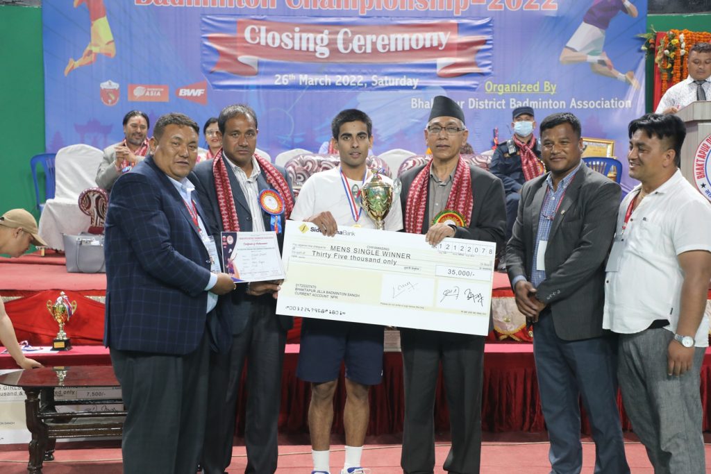 पुरुष एकलतर्फ राष्ट्रिय च्याम्पियन धामीले रिभाईभ लिजर पार्कका बिश्व जुनियर नम्बर एक खेलाडी प्रिन्स दाहाललाई २१–१५, १२–२१ र २१–१२ को अन्तरमा पराजित गर्दै उपािध उचालेका हुन् । पुलिसका जीवन आचार्य र बिष्णु कटुवाल तेस्रो भए ।