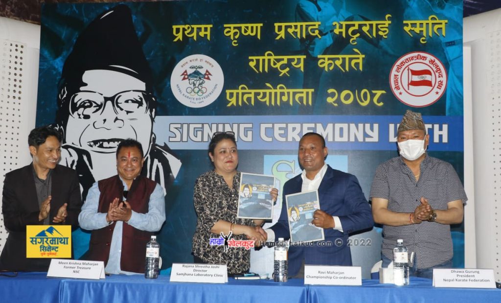 काठमाडौं (हाम्रो खेलकुद) – नेपाल कराते महासंघको तत्वाधानमा नेपाल लोकतान्त्रिक खेलकुद संघ तथा जिल्ला प्रमुख डोजो ललितपुर लगनखेलको संयुक्त आयोजनामा हुने पूर्व प्रधानमन्त्री कृष्ण प्रसाद भट्टराईको स्मृतिमा राष्ट्रिय कराते प्रतियोगितालाई सम्झना ल्याब्रोटरी क्लिनिक (एसएलसी) मुख्य प्रायोजक बनेको छ ।