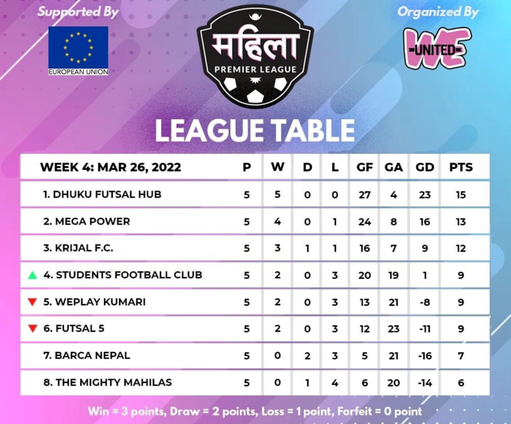 लिगको चौथो साताको खेलमा ढुकुले दि माइथी महिलाजमाथि ६–१ को फराकिलो जित दर्ता गर्दै लिगमा अपराजित रहन सफल भएको हो ।