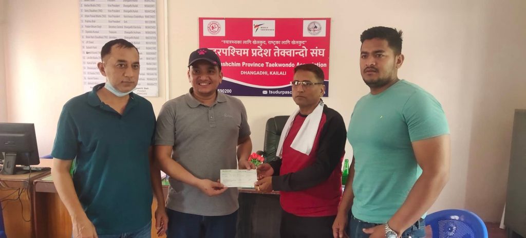 नेपाल तेक्वान्दो संघका सुदुरपश्चिम ईन्चार्ज साम्राज्य विक्रम पाण्डेयको पहलमा पठाईएको नगद ५० हजारको चेक प्रशिक्षक सिंहलाई सुदुरपश्चिम प्रदेश तेक्वान्दो संघका अध्यक्ष सुवाश शाहीले हस्तान्तरण गरे ।