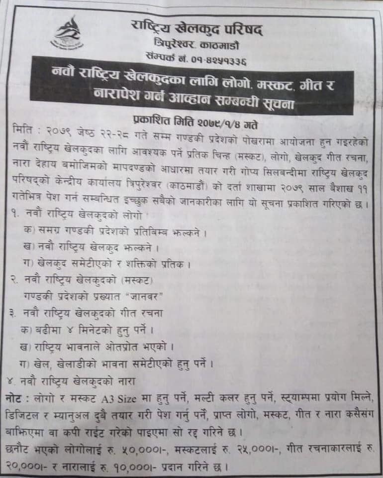 राखेपले आइतबार खुल्ला प्रतिस्पर्धाबाट लोगो, मस्कट, गीत रचना र नारा छनोट गर्न सूचना जारी गरेको हो । राखेपले यहिँ वैशाख ११ गतेभित्र लोगो, मस्कट, गीत रचना र नारा पेश गर्ने समयसिमा तोकेको छ । गण्डकी प्रदेशको पोखरामा आयोजना हुने नवौं राष्ट्रिय खेलकुद जेठ २२ देखी २८ गतेसम्म हुने तय भइसकेको छ ।
