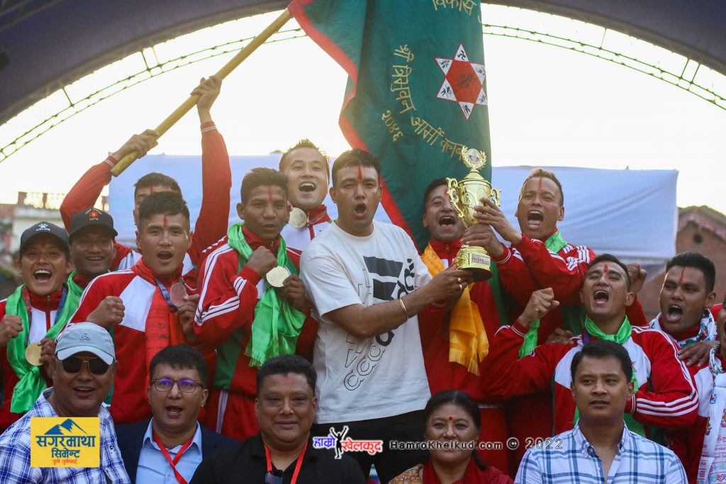 बसन्तपुर डबलीमा शनिबार भएको अन्तिम दिन ८ स्वर्ण र ४ रजतपदक जित्दै टिम च्याम्पियन बनेको हो । दोस्रो भएको एपिएफले २ स्वर्ण, ४ रजत ३ कास्य जित्न सफल भए । समान २ स्वर्ण, रजत र कास्य जितेको पुलिस तेस्रो भयो । प्रदेश १ र प्रदेश ७ ले समान एक रजत जिते ।