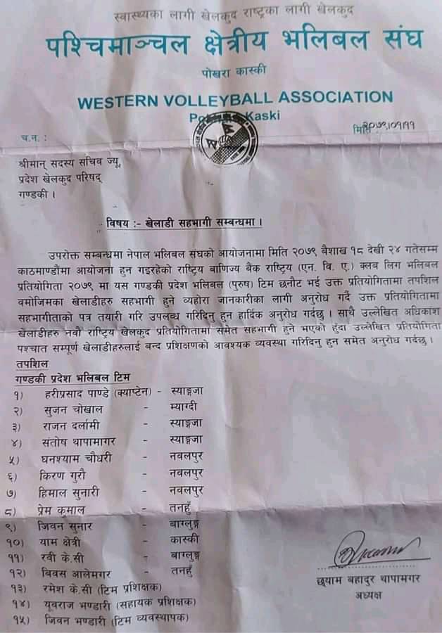 पश्चिमाञ्चल क्षेत्रीय भलिबल संघले १२ खेलाडी र ३ अफिसियलसहितको १५ सदस्यीय टोली घोषणा गरेको हो । गण्डकीको कप्तानी हरि प्रसाद पाण्डेले गर्नेछन् ।