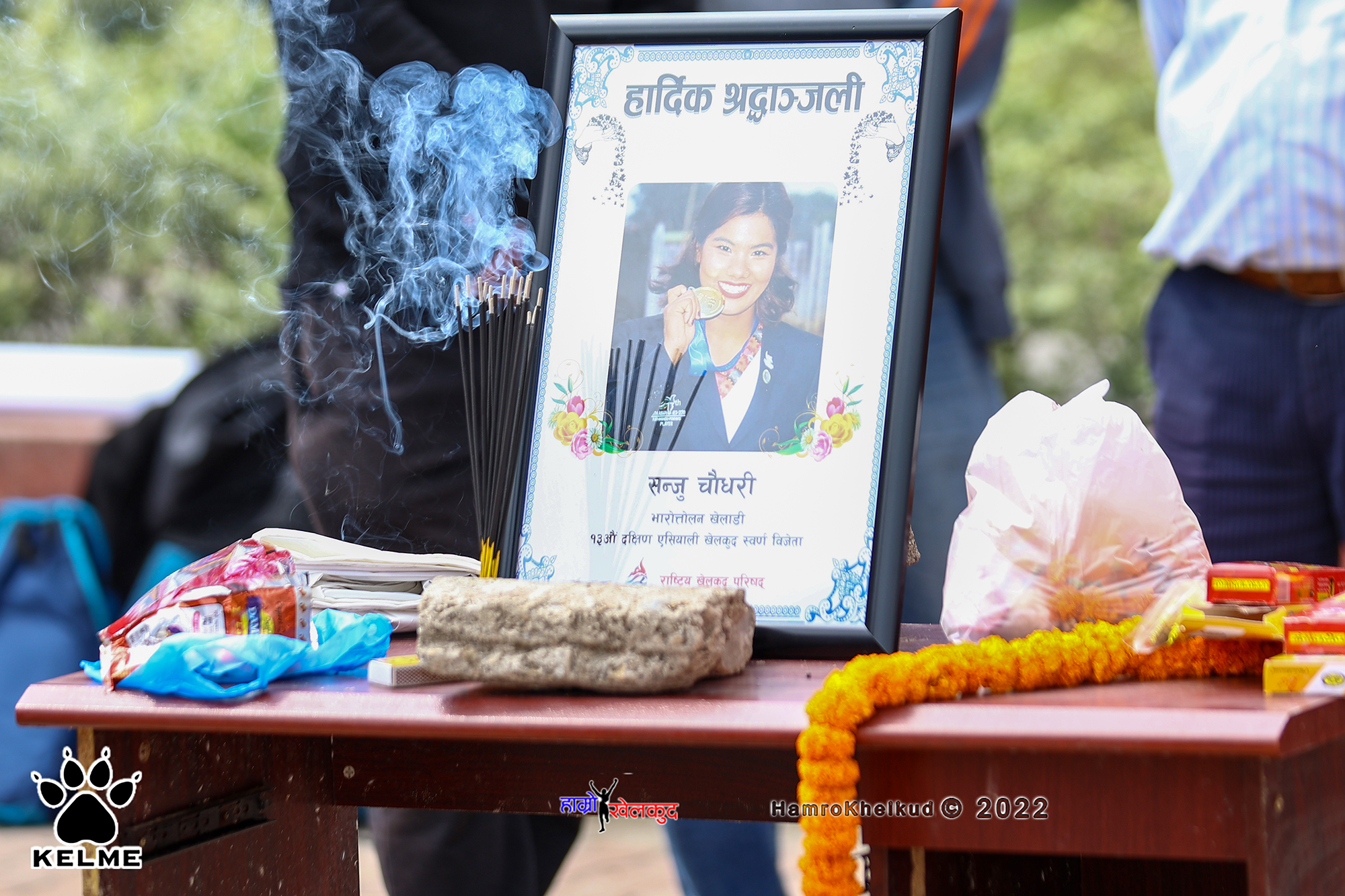 काठमाडौं (हाम्रो खेलकुद) – १३औं सागमा नेपालका लागि भारोत्तोलनबाट स्वर्ण पदक दिलाउन सफल खेलाडी स्वर्गिय सञ्जु चौधरीलाई राष्ट्रिय खेलकुद परिषदमा मंगलबार अन्तिम श्रद्धान्जली अर्पण गरिएको छ ।