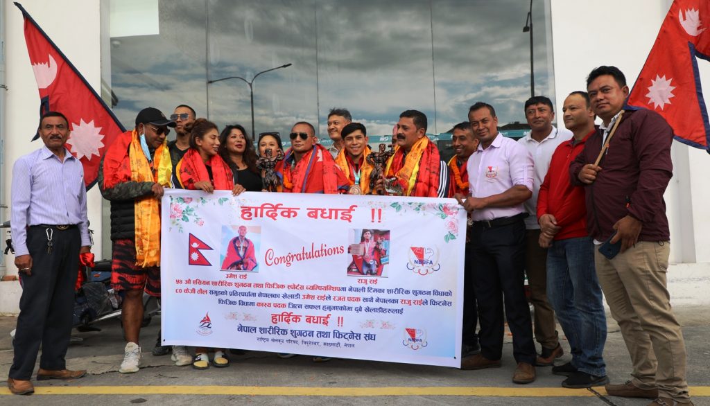 काठमाडौं (हाम्रो खेलकुद) – माल्दिभ्समा आयोजना भएको ५४औं एशियन शारिरीक सुगठन तथा फिजिक स्पोर्टस् च्याम्पियनसिप २०२२ मा पदक प्राप्त गर्दै राष्ट्रको गौरव बढाउने खेलाडी लगायत नेपाली टोलीलाई शुक्रबार त्रिभुवन अन्तर्राष्ट्रिय विमानस्थलमा स्वागत गरेको छ ।