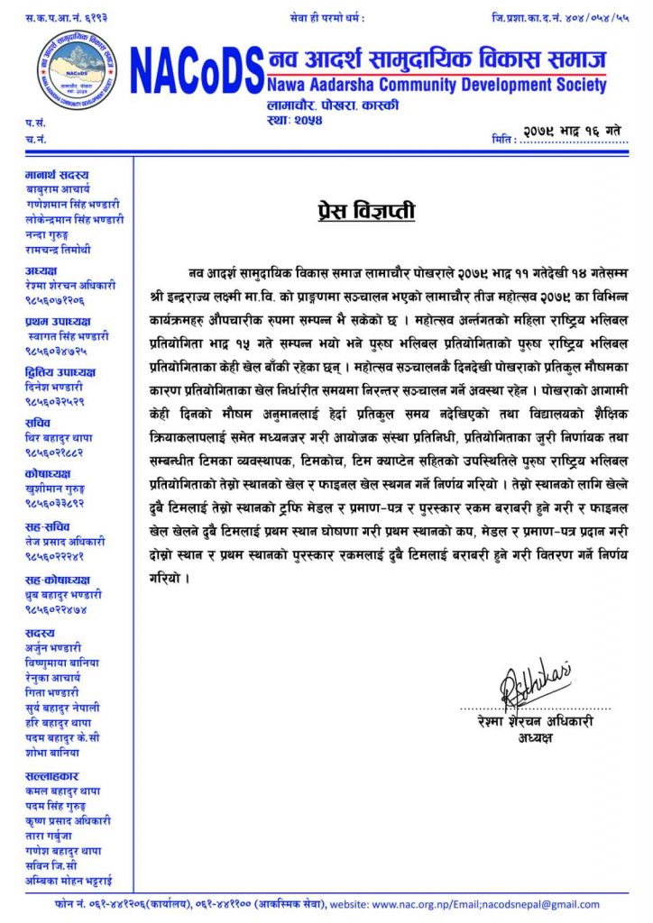 पोखरा (हाम्रो खेलकुद) – लगातारको वर्षापछि खेल हुन नसकेपछि आयोजक नव आदर्श सामुदायिक विकास समाजले लामाचौर कप महिला तथा पुरुष राष्ट्रिय भलिबल प्रतियोगिता अन्तरगत पुरुषतर्फ गण्डकी प्रदेश र विभागीय नेपाल पुलिस क्लबलाई संयुक्त विजेता घोषणा गरेको छ ।