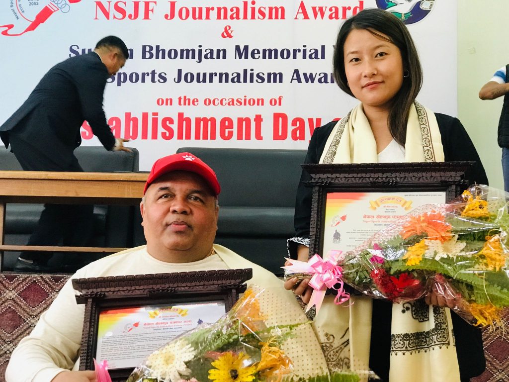 काठमाडौं (हाम्रो खेलकुद) – नेपाल खेलकुद पत्रकार मन्च (एनएसजेएफ) को २७औं स्थापना दिवसको अवसरमा सोमबार एनएसजेएफ पत्रकारिता अवार्डबाट जयदेव गौतम र सुमन बम्जन युवा पत्रकारिताबाट गीता राई सम्मानित भएका छन् ।