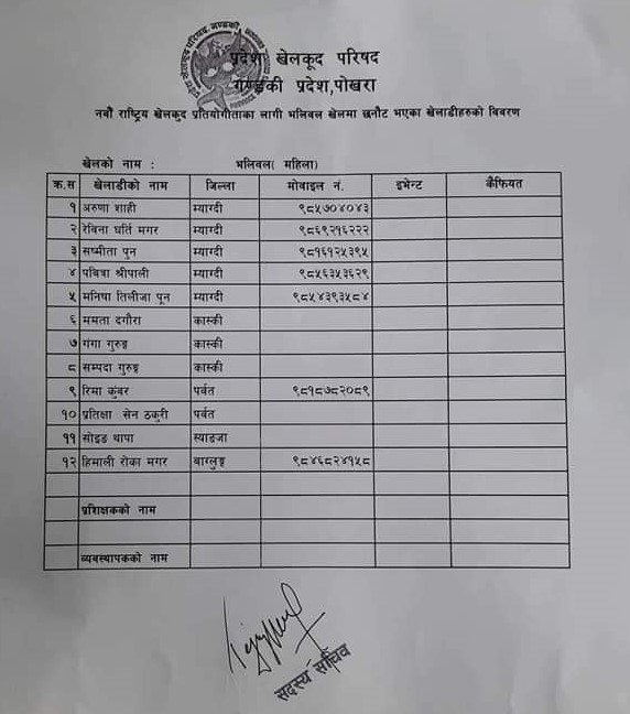 टोलीको प्रशिक्षकमा रमेश केसी र व्यवस्थापकमा जीवन भण्डारी रहेका छन् । बन्द प्रशिक्षणका लागि शनिबार नै प्रशिक्षकसँग सम्पर्क गर्न आग्रह गरिएको छ । नवौं राष्ट्रिय खेलकुद असोज २८ देखि कार्तिक ३ सम्म गण्डकी प्रदेशमा आयोजना हुँदैछ ।
