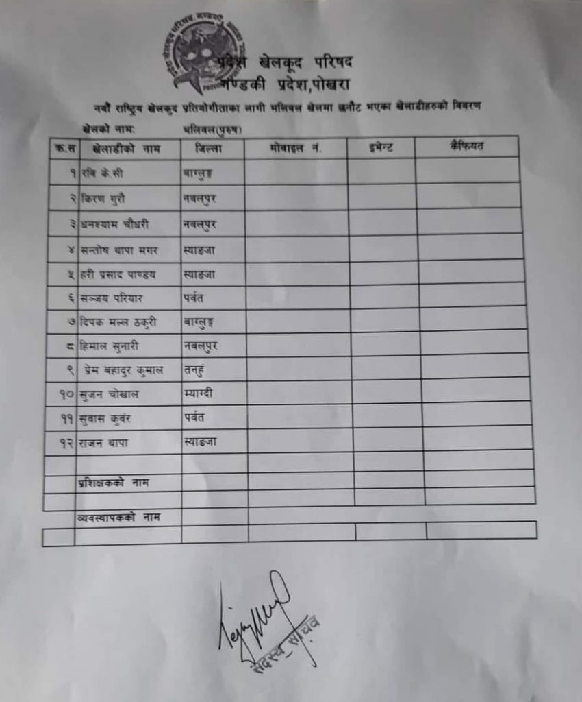 प्रदेश खेलकुद बिकास परिषद् गण्डकीले पुरुषतर्फ हरि पाण्डेको तथा महिलामा राष्ट्रिय टोलीको समेत कप्तान रहेकी अरुणा शाहीको कप्तानीमा समान १२ सदस्यीय टोली घोषणा गरेको हो ।