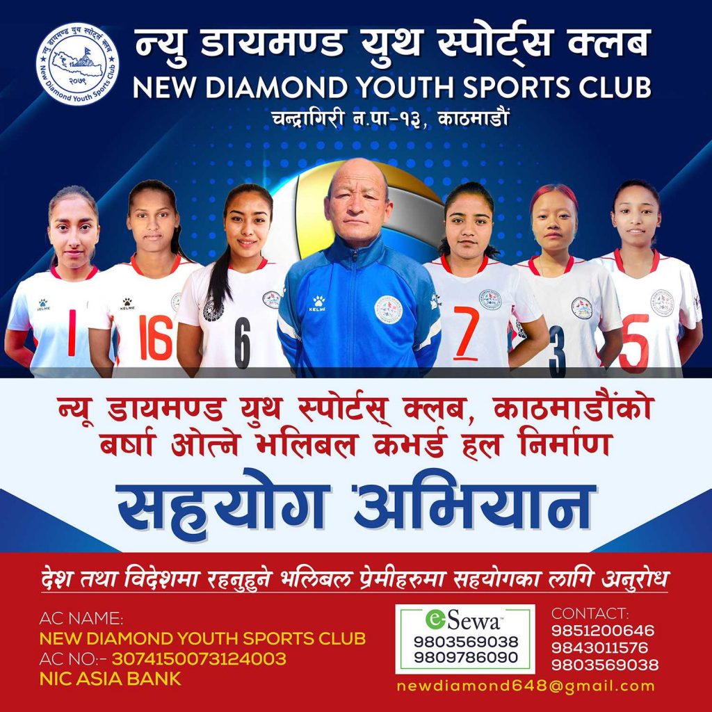काठमाडौं (हाम्रो खेलकुद) – घरेलु भलिबलको चर्चित न्यू डायमन्ड युथ स्पोर्ट्स क्लबले आफ्नै कभर्ड हल निर्माणकाे थालनीसँगै बुधबारदेखि सहयोग अभियानको शुभारम्भ गरेको छ ।