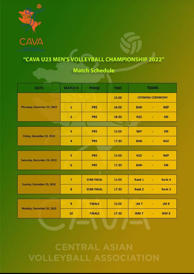 सार्वजनिक भएको तालिका अनुसार नेपालले उद्घाटन खेलमा आयोजक बंगलादेशसँग खेल्नेछ । सोही दिन किर्गिस्तान र श्रीलंकाबीच प्रतिस्पर्धा हुनेछ । यो खेल ७ पुसमा हुनेछ ।