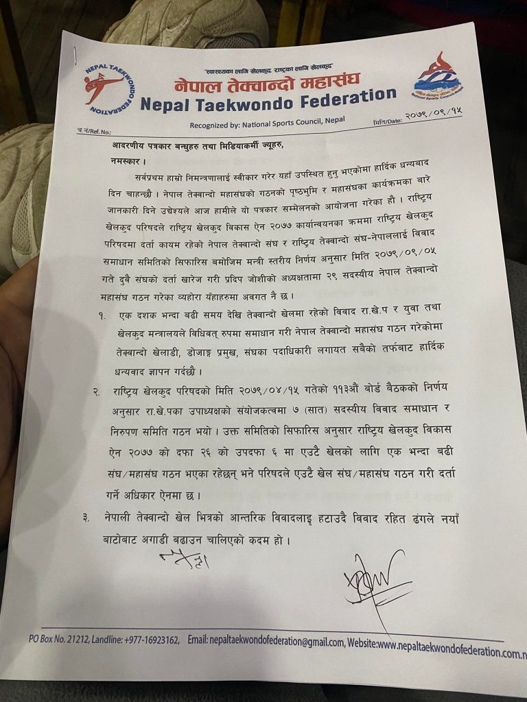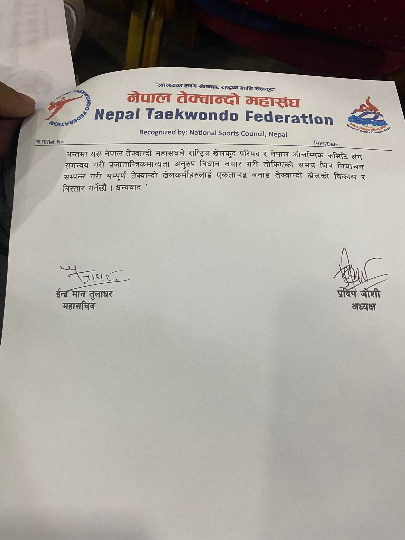 पुस ५ गते राखेपले विवादित भनिएका नेपाल तेक्वान्दो संघ र राष्ट्रिय तेक्वान्दो संघको दर्ता राखेज गरि प्रदीपराज जोशीको अध्यक्षतामा तेक्वान्दो महासंघ गठन गरेको थियो ।