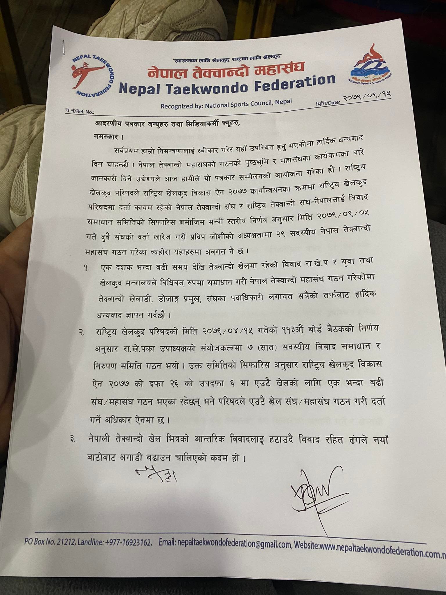 काठमाडौं (हाम्रो खेलकुद)– राष्ट्रिय खेलकुद परिषद् (राखेप) ले तेक्वान्दोका दुई संघ खारेज गर्दै नेपाल तेक्वान्दो महासंघ गठन गरेपछिको उत्पन्न विवाद तत्कालका लागि समाधानका लागि अब अदालतको निर्णय पर्खनुपर्ने अवस्था तयार भएको छ ।