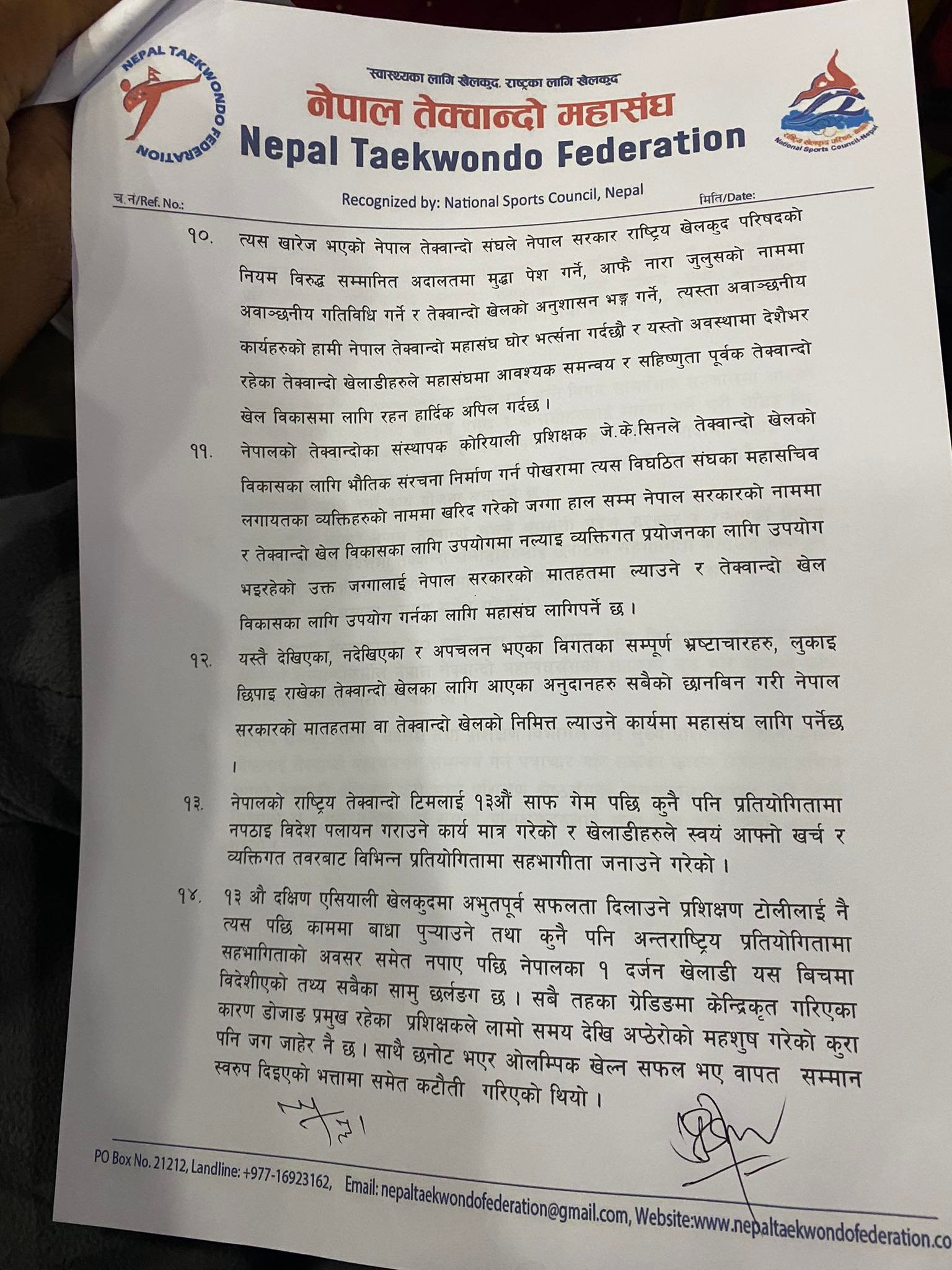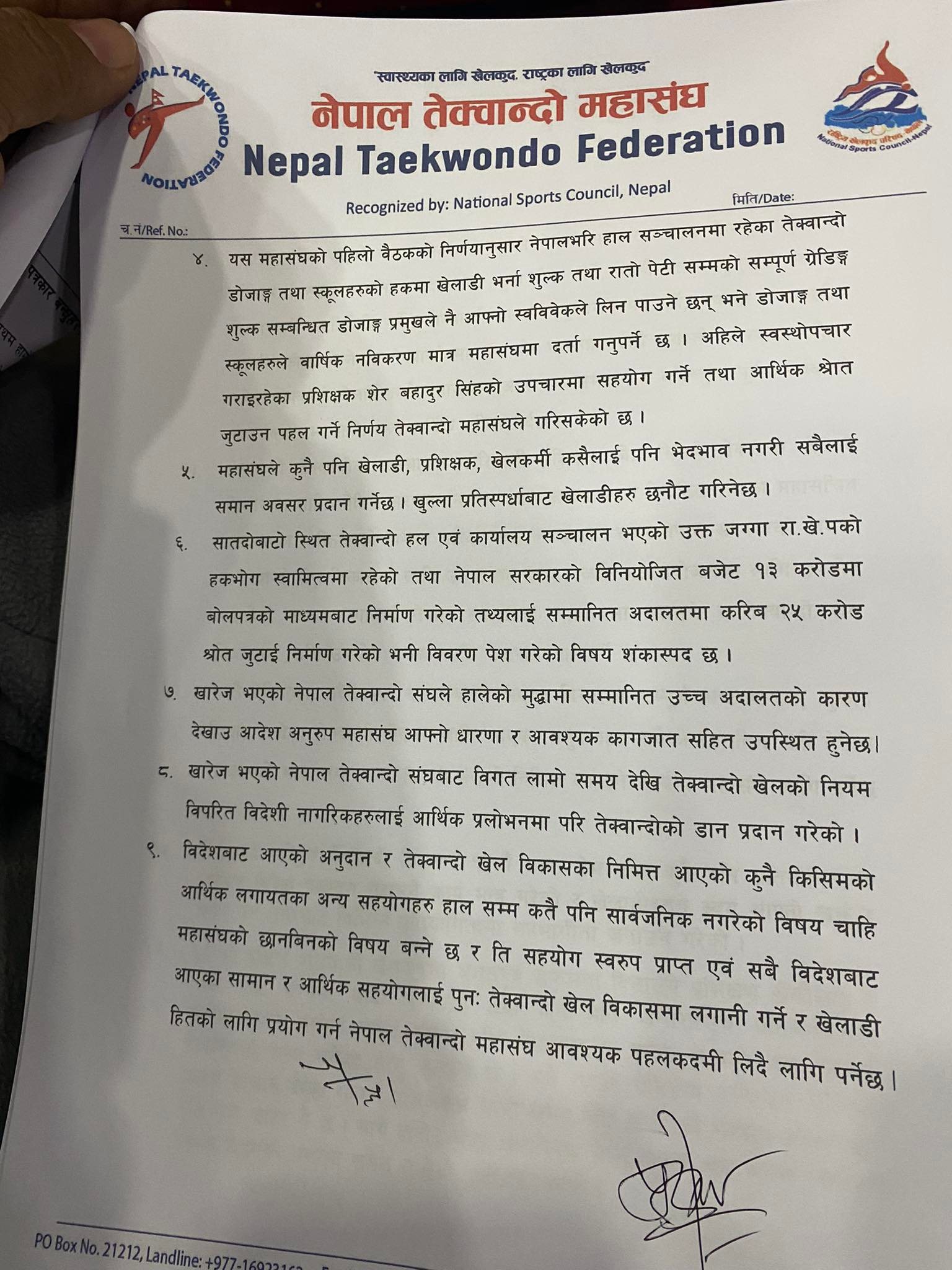 प्रकाश शम्सेर राणाको अध्यक्षतामा रहेको तेक्वान्दो संघले युवा तथा खेलकुद मन्त्रालय, राखेपसहित ५ संस्थाविरुद्ध उच्च अदालत पाटनमा दायर गरेको मुद्दाको किनारा नलाग्दा सम्म कानुनी रुपमा तेक्वान्दोको विवाद अन्त्य नहुने देखिएको छ ।