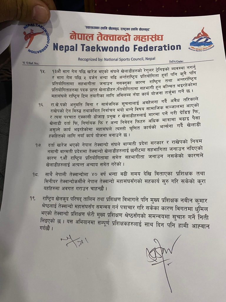 राखेपका उपाध्यक्ष समेत रहेका शिव कोइरालाको नेतृत्वमा रहेको राष्ट्रिय तेक्वान्दो संघले राखेपको निर्णयलाई स्वीकार गरेपनि राणा अध्यक्ष रहेको संघले भने त्यसको विरोध गर्दै आएको छ । संघले केहि दिन अघि राखेपको निर्णयविरुद्ध र्याली प्रदर्शन पनि गरेको थियो ।