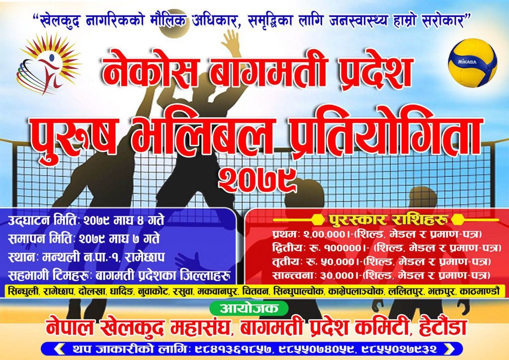 रामेछाप (हाम्रो खेलकुद) – नेपाल खेलकुद महासंघ बागमती प्रदेश कमिटीको आयोजनामा रामेछापको मन्थलीमा नेकोस बागमती प्रदेश पुरुष भलिबल प्रतियोगिता आयोजना हुने भएको छ ।