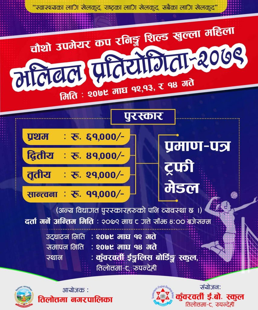 काठमाडौं (हाम्रो खेलुकद) – तिलोत्तमा नगरपालिका रुपन्देहीको आयोजनामा चौथो संस्करणको उपमेयर कप रनिङ शिल्ड खुल्ला महिला भलिबल प्रतियोगिता माघ दोस्रो सातादेखि आयोजना हुने भएको छ ।
