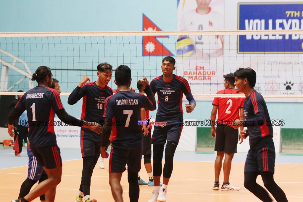 पहिलो र दोस्रो सेटमा क्रमशः २५–२३ र २५–२० को जित निकालेको ढोरपाटनले त्यसपछि दुई सेट क्रमश १८–२५ र २२–२५ ले गुमाएपछि खेल पाँचौ सेटमा लम्बिएको थियो । तर, पाँचौ सेटमा ढोरपाटनले १५–९ को सहज जित निकाल्न सफल भयो ।