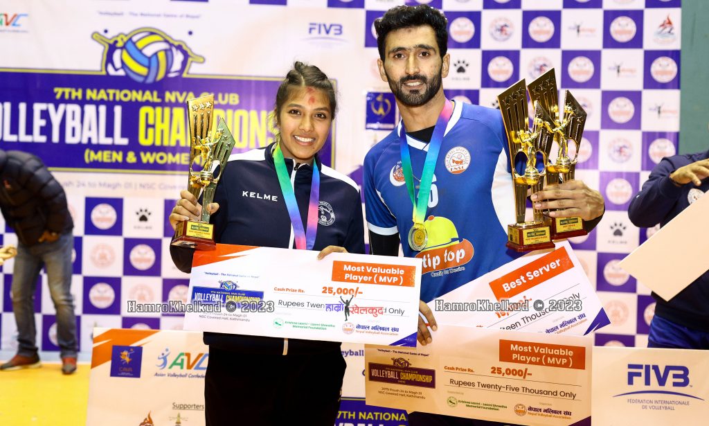 काठमाडौं (हाम्रो खेलकुद) – च्याम्पियन टिप टप हेल्प नेपालका पाकिस्तानी मुवासर राजा र नेपाल पुलिस क्लबक स्पाइकर उषा भण्डारी सातौं एनभिए राष्ट्रिय महिला तथा पुरुष क्लब भलिबल च्याम्पियनसिपमा सर्वाेत्कृष्ट खेलाडी घोषित भएका छन् ।