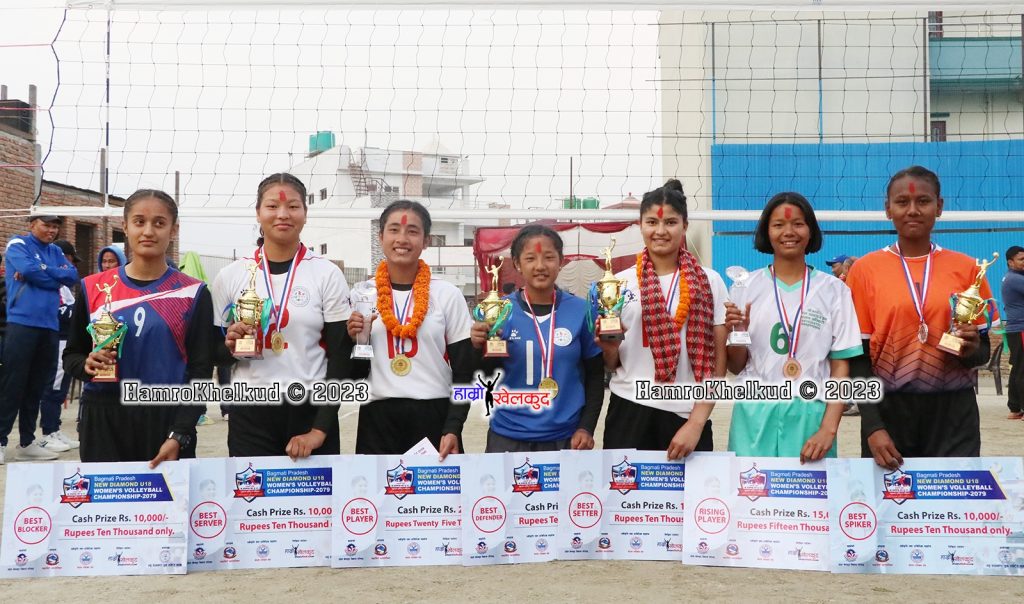 डायमण्डकी सलिना बुढामगर उत्कृष्ट सर्भर, डायमण्डकै प्रगति नाथ सेटर, डायमण्डकै एन्जिला प्रधान उत्कृष्ट डिफेन्डर र डायमण्डकै कुमार राई उत्कृष्ट प्रशिक्षक चुनिए ।