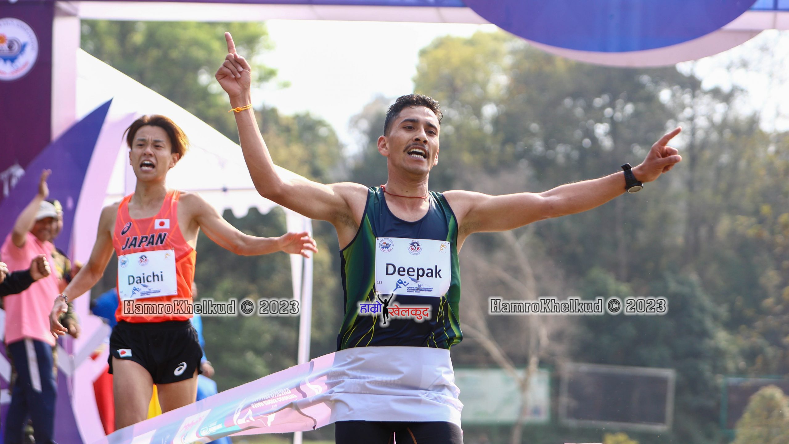 सनियर पुरुष १० किलोमिटर दौडमा दीपक अधिकारीले स्वर्ण पदक जितेका हुन् । सो इभेन्टमा मुकुशबहादुर पालले कास्य पदक जिते । जापानका डाइची कामिनोले ३३ मिनेट ५२.०६ मा दौड पूरा गरेर रजत पदक पाए ।