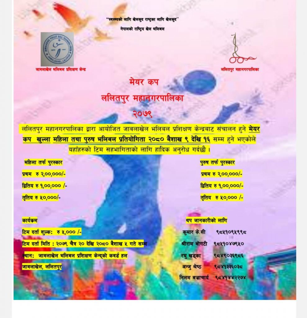 काठमाडौं (हाम्रो खेलकुद) – ललितपुर महानगरपालिकाको आयोजनामा बैशाख दोस्रो सातादेखि मेयर कप खुल्ला महिला तथा पुरुष भलिबल प्रतियोगिता आयोजना हुने भएको छ ।