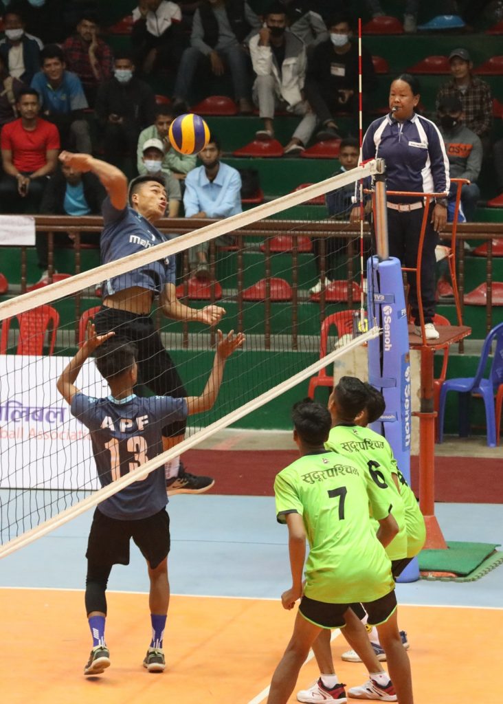 त्रिपुरेश्वरस्थित राष्ट्रिय खेलकुद परिषद (राखेप) को कभर्डहलमा बिहीबार भएको समूह चरणको अन्तिम खेलमा एपीएफले सुदूरपश्चिम प्रदेशलाई ३–१ को सेटमा पराजित गर्दै एपिएफ समूह ‘ख’ को उपविजेता बन्दै अन्तिम चारमा पुग्न सफल भएको हो ।