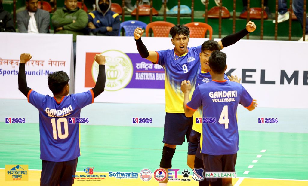 त्रिपुरेश्वरस्थित राष्ट्रिय खेलकुद परिषद (राखेप) को कभर्डहलमा बुधबार भएको दोस्रो क्वाटरफाइनलमा एपिएफलाई ३–० को सोझो सेटमा पराजित गर्दै गण्डकीले अन्तिम चारमा स्थान पक्का गरेको हो ।