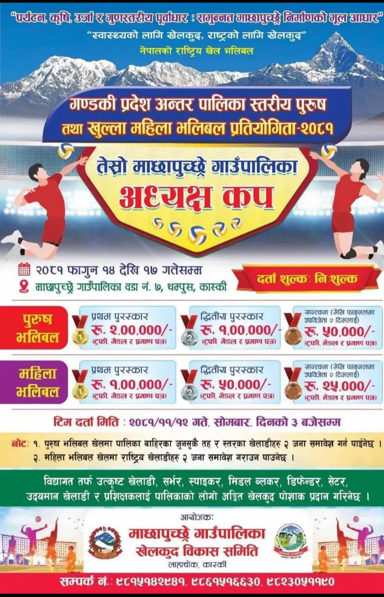 काठमाडौं (हाम्रो खेलकुद) – तेस्रो संस्करणको माछापुच्छ्रे गाँउपालिका अध्यक्ष कप गण्डकी प्रदेश अन्तरपालिका स्तरीय पुरुष तथा खुल्ला महिला भलिबल प्रतियोगिता यसै सातादेखि हुने भएको छ ।