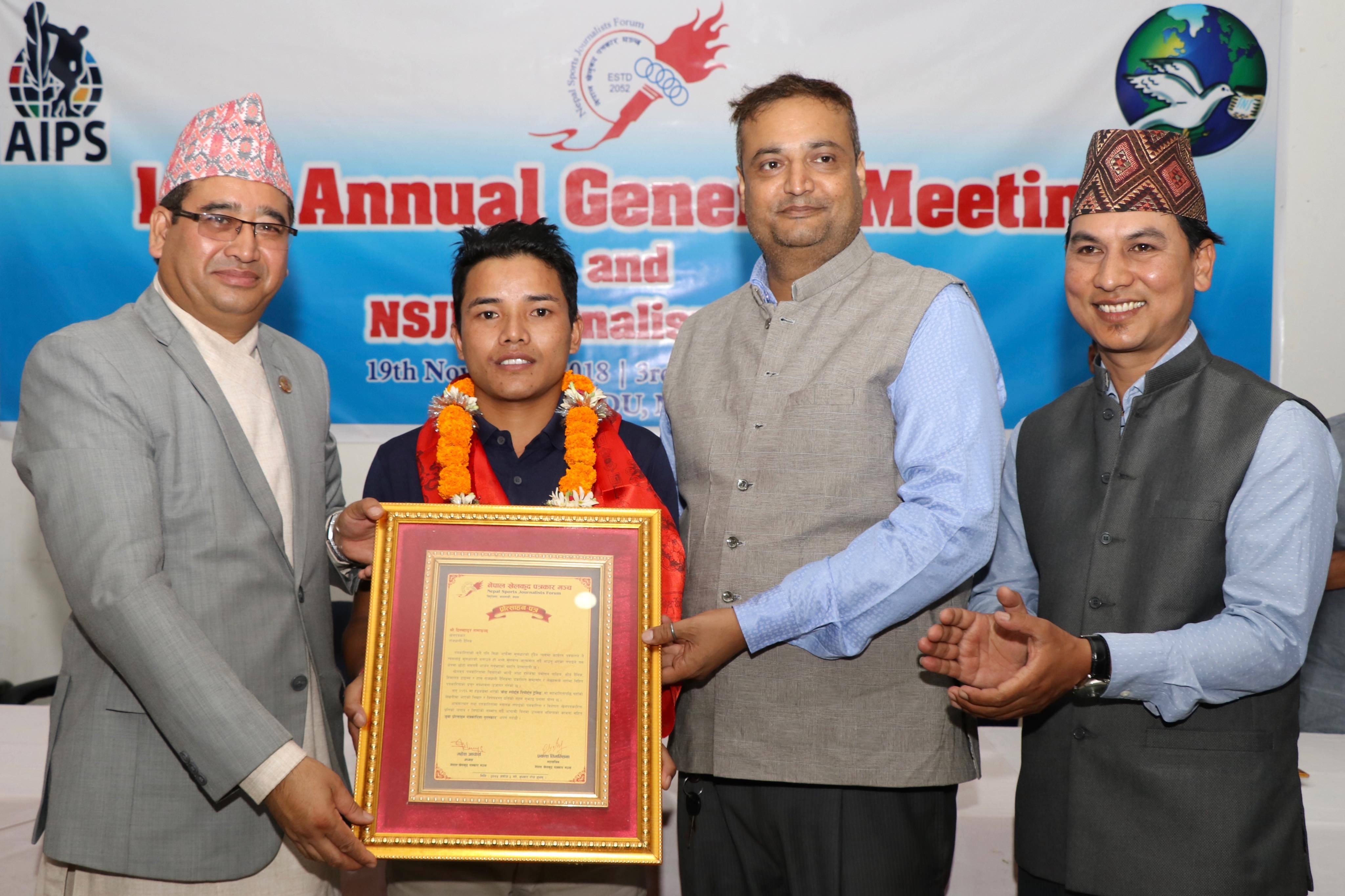 मञ्चले आफ्नो १४औं साधरण सभाको अवसरमा नेपाली खेलकुद पत्रकारितामा विशिष्ट योगदान गर्नुभएका सीताराम अग्रहरिलाई ‘एनएसजेएफ पत्रकारिता सम्मान २०७५’बाट सम्मानित गरेको हो ।