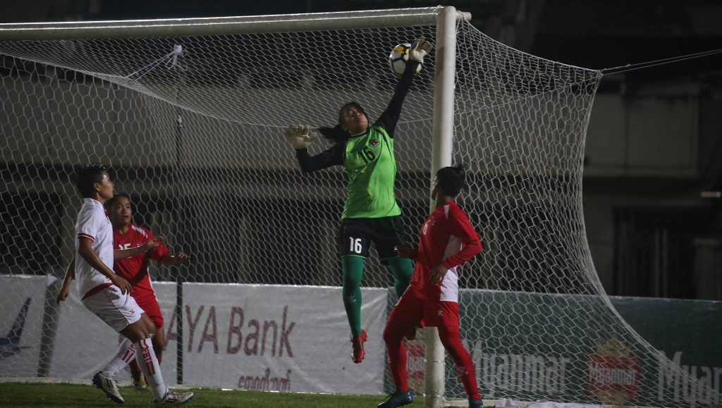 फिफा वरियतामा नेपालभन्दा ६४ स्थान माथि रहेको म्यानमारविरुद्ध नेपालले खेलको सुरुवाती समयमै अग्रता लिएको थियो । नेपालको लागि खेलको दोस्रो मिनेटमा सावित्रा भण्डारीले पेनाल्टीमा गोल गर्दै अग्रता दिलाएकी थिइन् । खेल सुरु भएको ४३ सेकेन्डमै म्यानमारकी डिफेन्डर वाई वाई औङले सावित्रलाई पेनाल्टी क्षेत्रभित्र लडाएपछि नेपालले पेनाल्टी पाएको थियो । तर खिन मो वाईले १३ औं मिनेटमा गोल गर्दै खेल बराबरीमा ल्याइन । वाईले प्रहार गरेको कर्नर नेपाली गोलरक्षक एन्जिला तुम्बापो सुब्बाले रोक्ने प्रयास गर्दा सिधै गोलमा परिणत भएको थियो ।