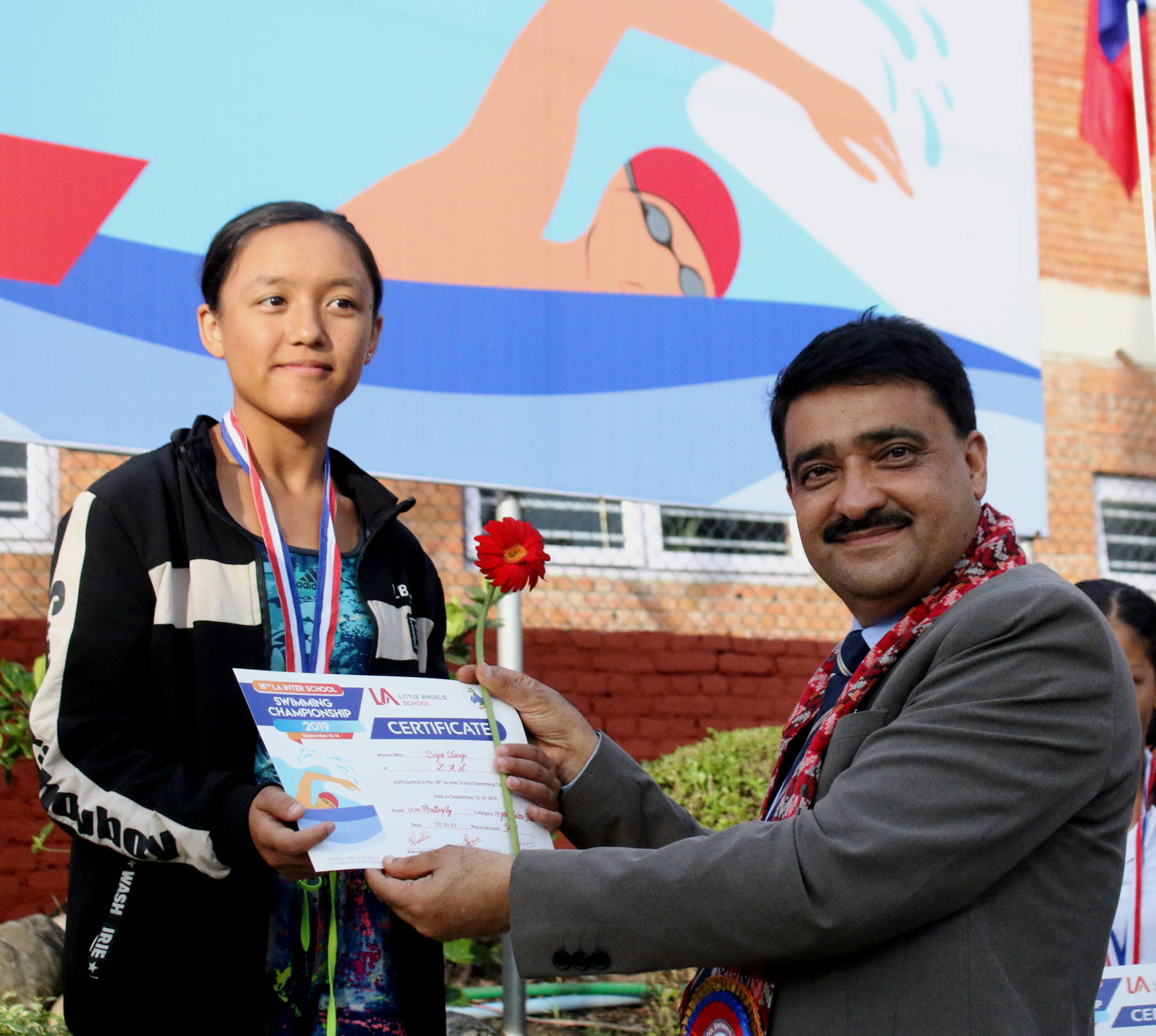 १० बर्ष मुनीको छात्रा २५ मिटर बटरफ्यालमा सुभताराकी टिसा महर्जन पहिलो हुदा छात्रतर्फ निसर्गबाटिकाका रेवन्तवहादुर श्रेष्ठ पहिलो भएका छन् । प्रतियोगितामा आयोजक एलएले १४६ अंक,निर्सगबाटिकाले १०२ र संस्कृति इन्टरनेश्नल स्कुलले ४५ अंक जोडेका छन् ।दुई दिने प्रतियोगिताको उद्घाटन युवा तथा खेलकुद मन्त्री जगतवहादुर सुनारले गरेका थिए ।