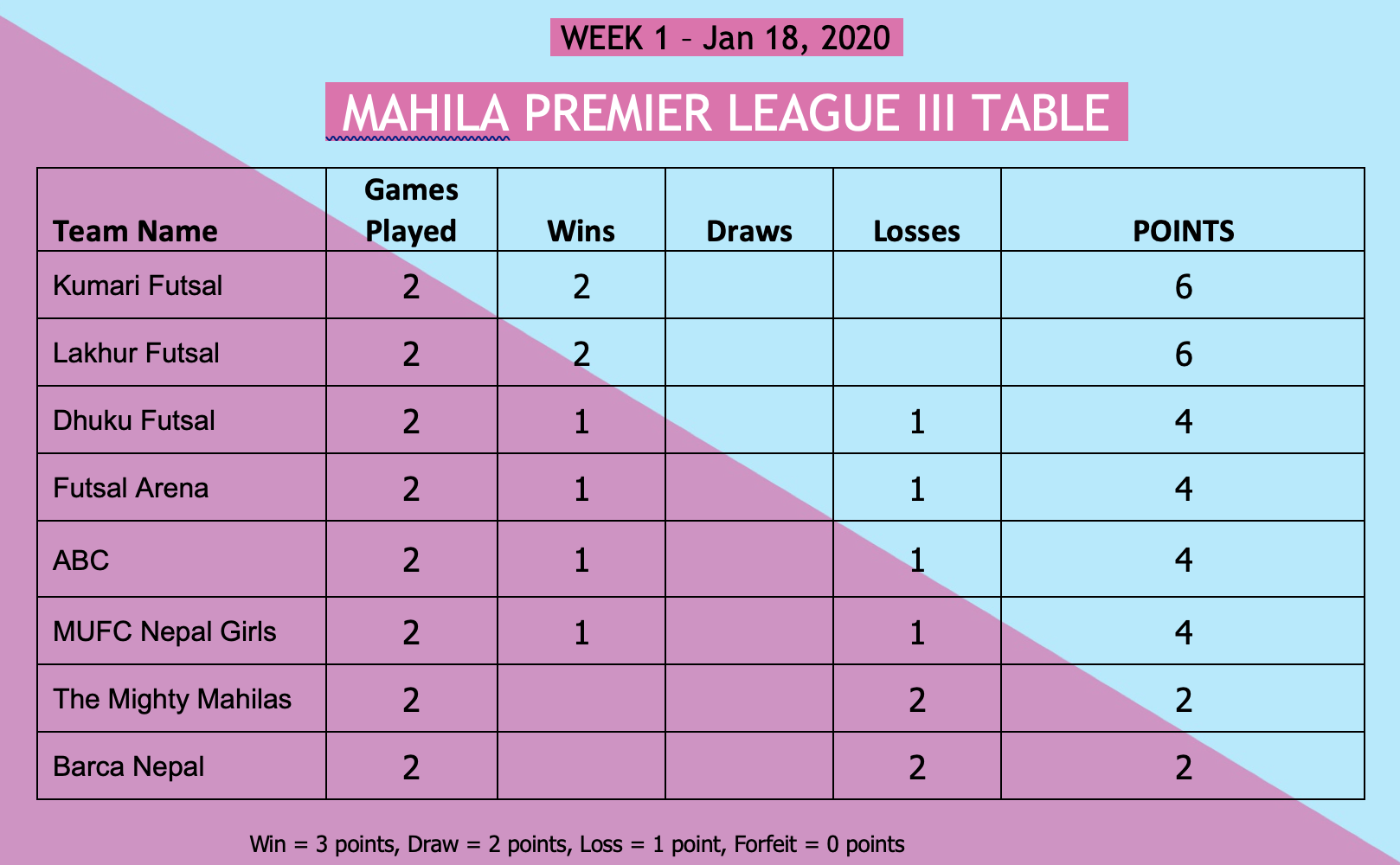 ग्रासरुट रिक्रिएसन सेन्टर, मन्डिखाटारमा शनिबार सुरु भएको महिला प्रिमियर लिग (एमपिएल) फुटसलमा कुमारी र लाकुरले दोहोरो जित निकाल्दा ढुकु फुटसल, फुटसल एरिना, एबीसी र एमयुएफसी नेपाल गल्र्सले समान १–१ जित निकालेका छन् । दि माइथी महिलाज् र बार्सा नेपाल जितबिहीन छ । लिगको पहिलो साता हरेक टिमले समान २–२ खेल खेलेको थियो ।