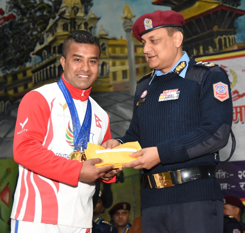 महाराजगन्जस्थित नेपाल प्रहरी प्रशिक्षण प्रतिष्ठानमा आयोजित कार्यक्रममा संगठन प्रमुख प्रहरी महानिरीक्षक सर्वेन्द्र खनालले खेलाडीलाई पुरस्कृत गरे । सोही अवसरमा प्रशिक्षकहरुलाई पनि प्रशंसा पत्र र दोसल्लाबाट सम्मान गरिएको थियो ।