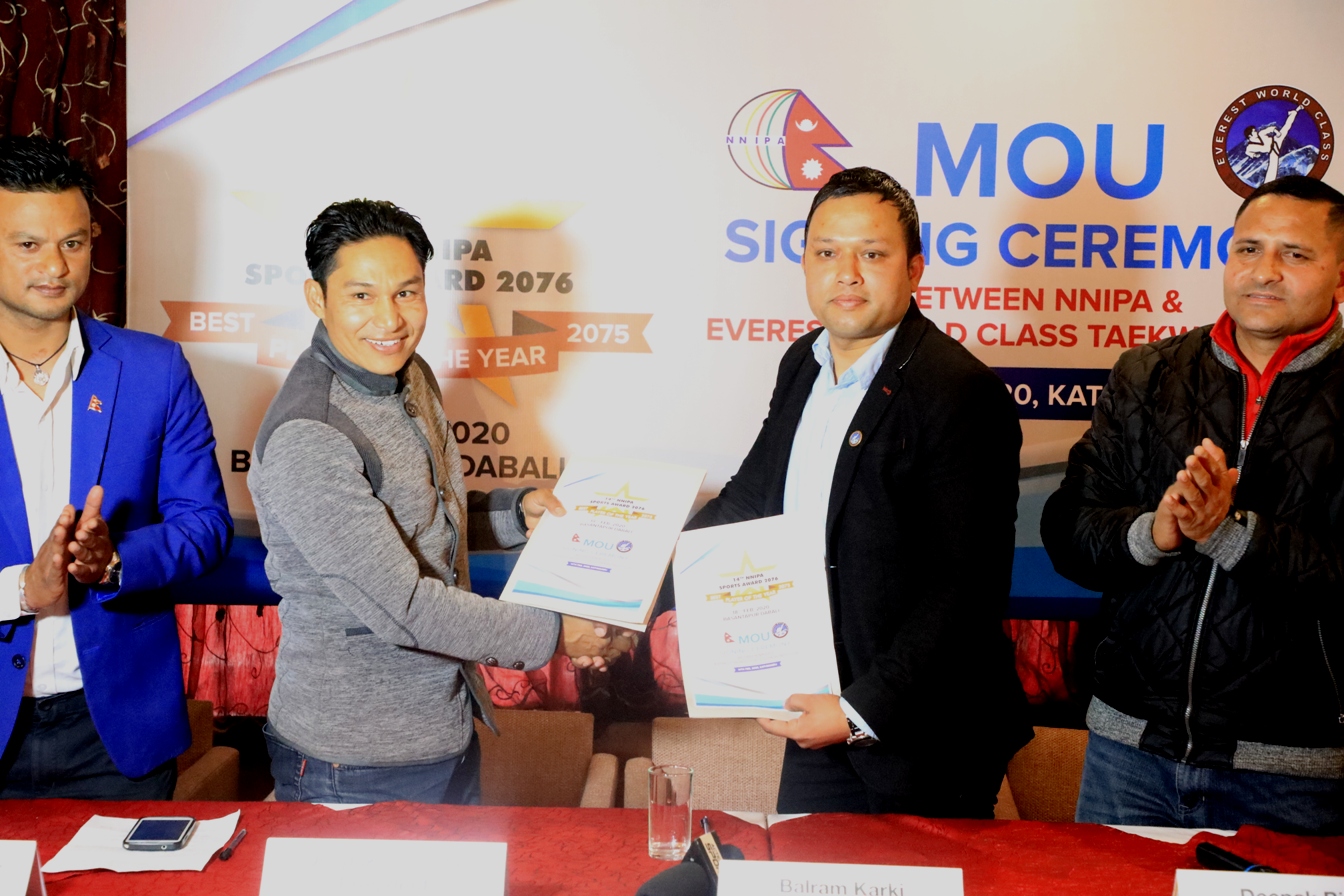 काठमाडौं (हाम्रो खेलकुद) – नेपाल राष्ट्रिय तथा अन्तराष्ट्रिय खेलाडी संघ (एनएनआइपिए) र एभरेष्ट वल्र्ड क्लास तेक्वान्दो अमेरिकाबीच शुक्रबार ५ वर्षे सम्झौता भएको छ ।