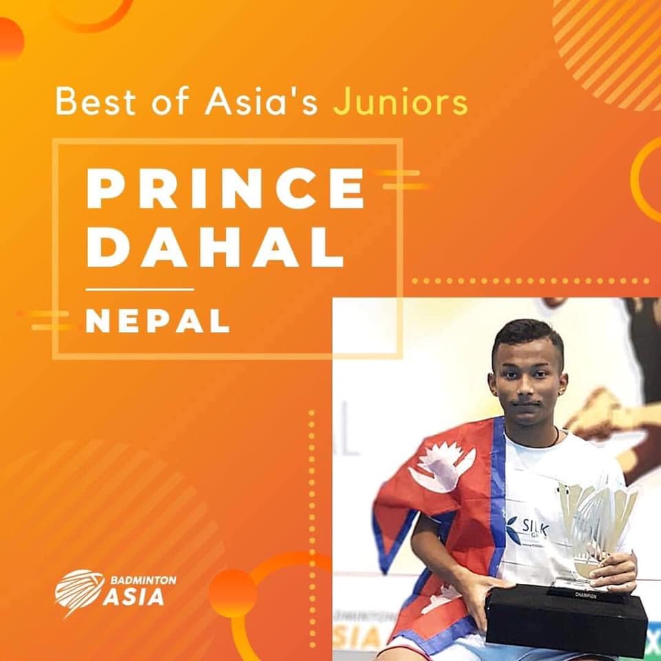काठमाडौं (हाम्रो खेलकुद) – नेपाली ब्याडमिन्टनका युवा स्टार प्रिन्स दाहाल ब्याडमिन्टन एसियाकै बेस्ट जुनियर खेलाडी बनेका छन् । ब्याडमिन्टन एसियाले प्रिन्सलाई पछिल्ला खेलहरुको प्रदर्शनको आधारमा बेस्ट जुनियर खेलाडी घोषणा गरेको हो ।
