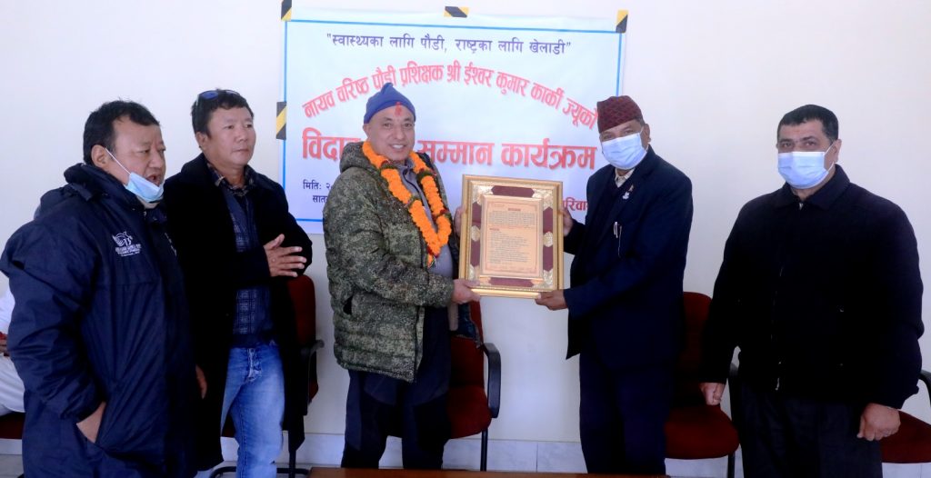 हाम्रो खेलकुद) – पौडीका बरिष्ठ प्रशिक्षक इश्वर कार्कीलाई बिदाई तथा सम्मान गरिएको छ । राष्ट्रिय खेलकुद परिषद्मा लामो समयसम्म कार्यरत रही उमेरहदका कारण सेवा निवृत्त कार्कीलाई पौडी प्रशिक्षक परिवारका तर्फबाट बिदाई तथा सम्मान गरिएको हो ।