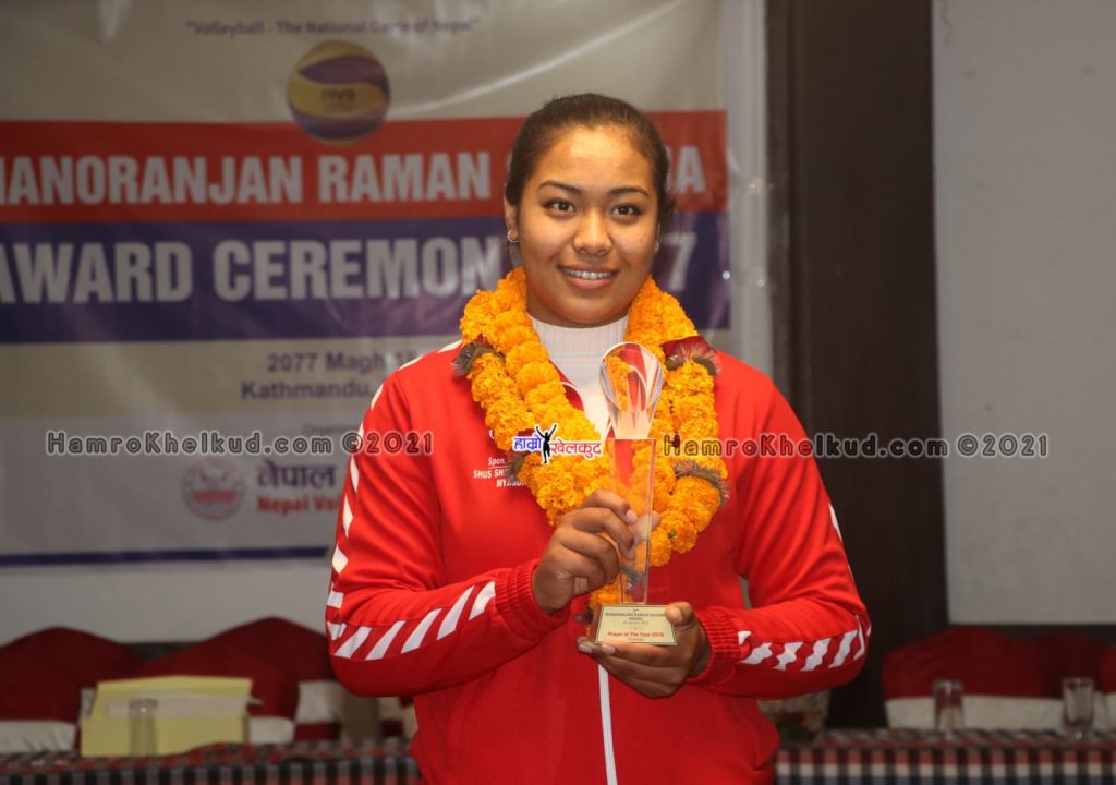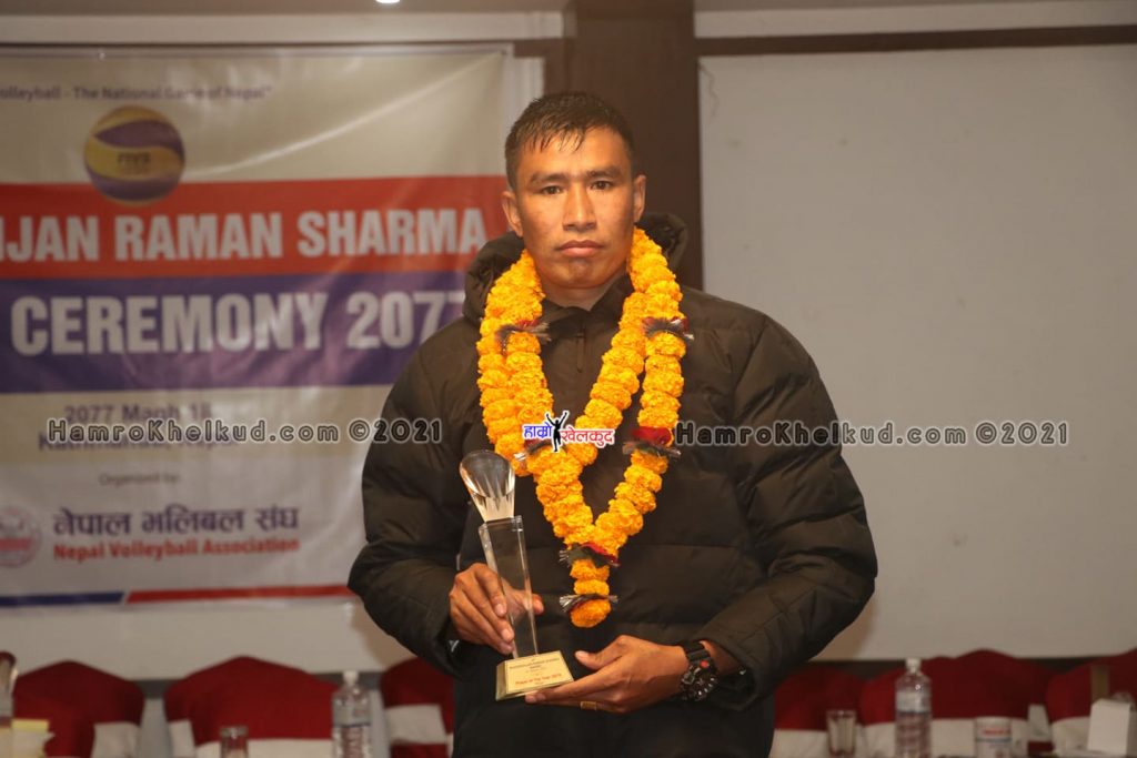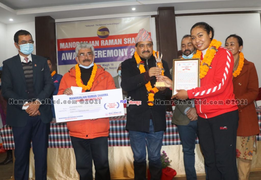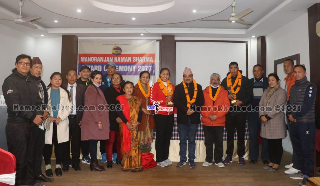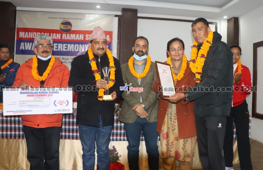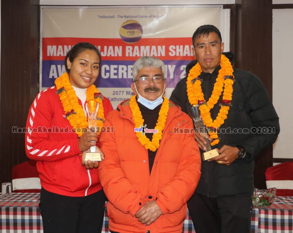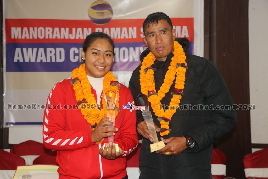 काठमाडौं (हाम्रो खेलकुद)– राष्ट्रिय भलिबल टोली पुरुषका कप्तान इम राना र महिलाकी प्रभावशाली खेलाडी प्रतिभा माली मनोरञ्जन शर्मा अवार्डबाट सम्मानित भएका छन् ।