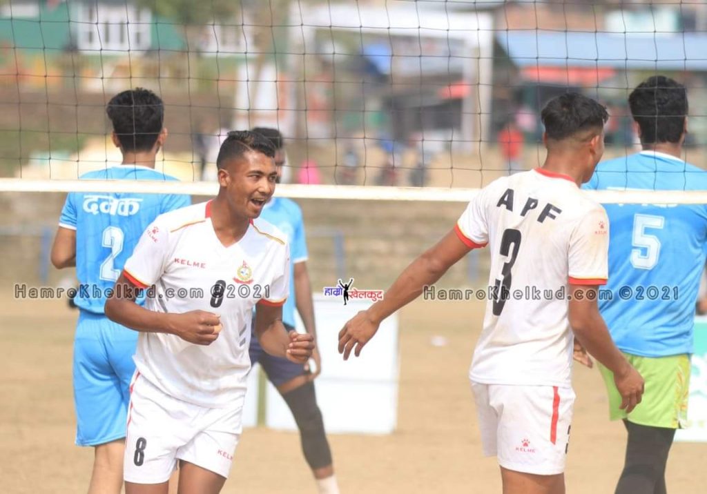 बिहिबार दोस्रो खेलमा दमक नगर भलिबल क्लबलाई ३-१ को सेटमा पराजित गर्दै एपिएफ समूह ‘बी’ को विजेताको रुपमा सेमिफाइनलमा प्रवेश गरेको हो । एपिएफले दमकलाई २५-२१, २२-२५, २५-११ र २५-१९ पराजित गरेको हो ।
