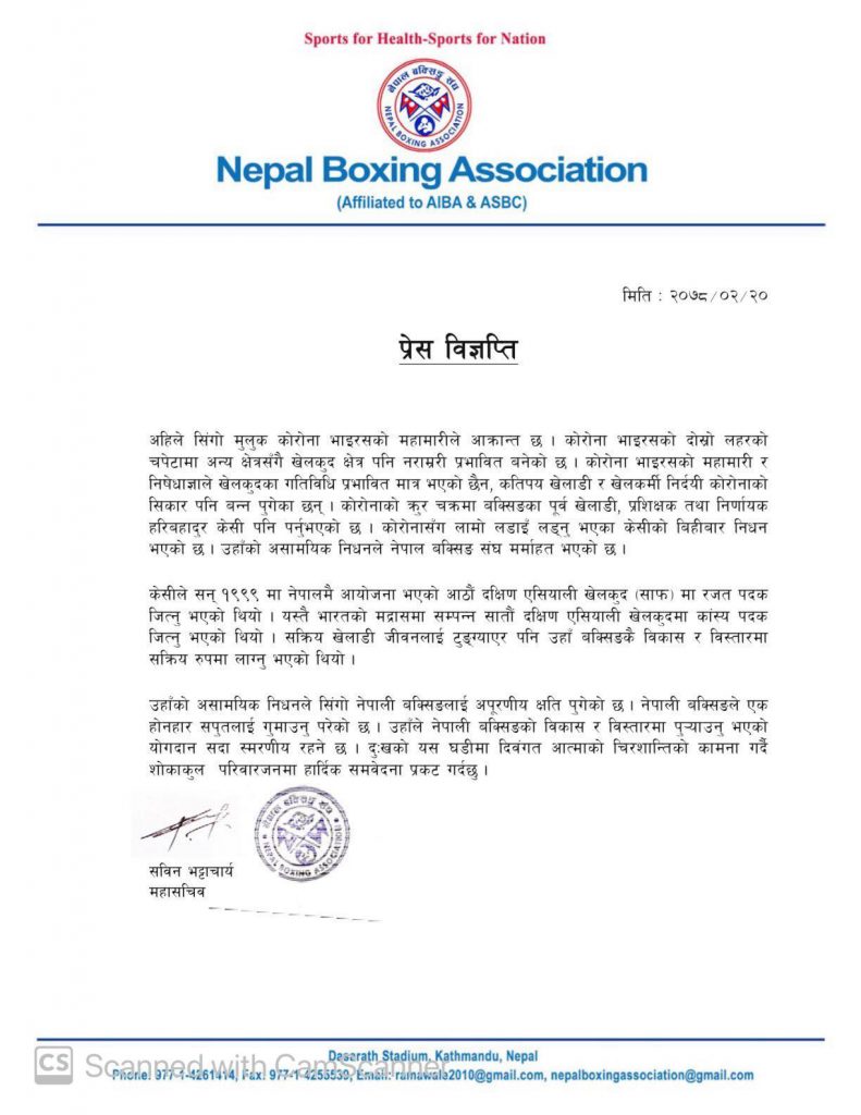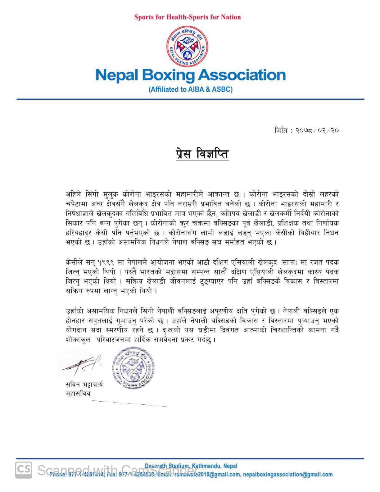 सक्रिय खेलाडी जीवनलाई टुङ्ग्याएर पनि उनले बक्सिङकै विकास र विस्तारमा सक्रिय रुपमा लागेका उनको असामयिक निधनले सिंगो नेपाली बक्सिङलाई अपूरणीय क्षति पुगेको, बक्सिङले होनाहार सपुत गुमाएको र उनले नेपाली बक्सिङको विकास र विस्तारमा पु¥याएको योगदान सदा स्मरणीय रहने विज्ञप्तिमा उल्लेख छ ।