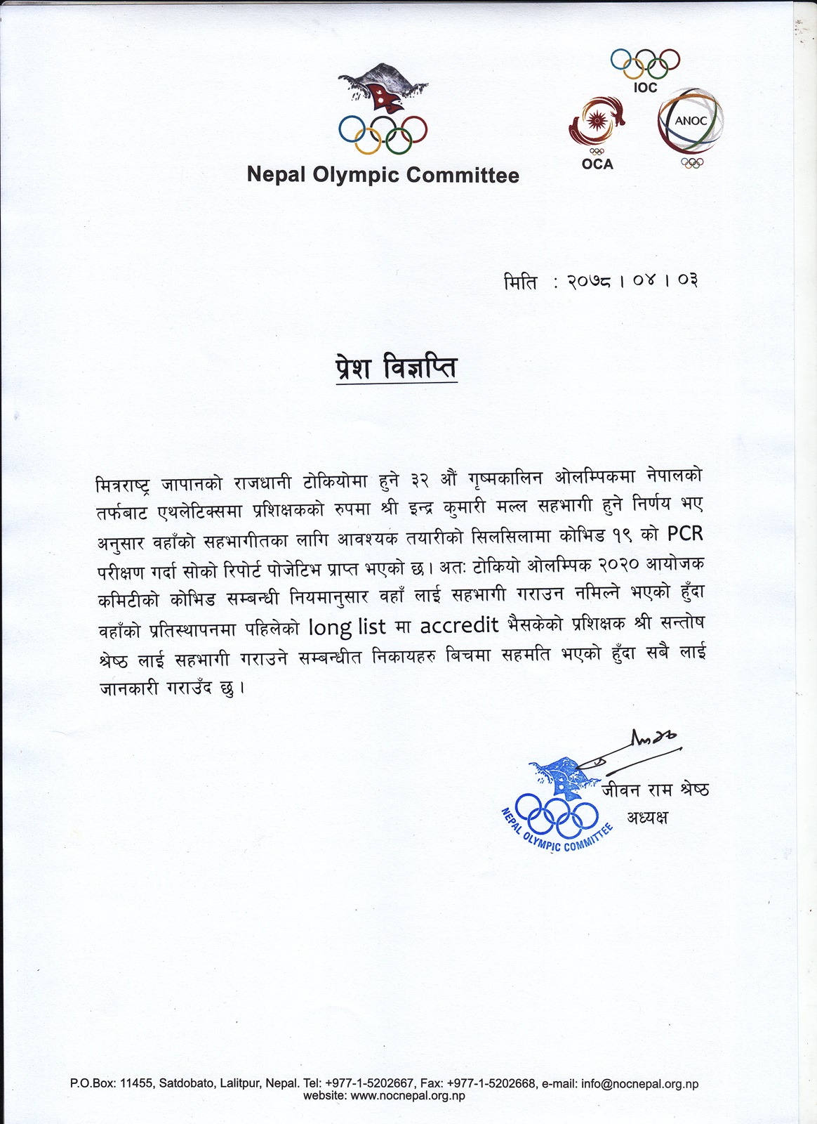 नेपाल ओलम्पिक कमिटी (एनओसी) ले आइतबार विज्ञप्ति जारी गर्दै मल्लको स्थानमा यसअघि ओलम्पिकको लङ लिस्टमा रहेका श्रेष्ठ जाने उल्लेख गरेको छ । यस विषयमा नेपाल एथलेटिक्स संघ र एनओसीबीच छलफल भएको बताइएको छ ।