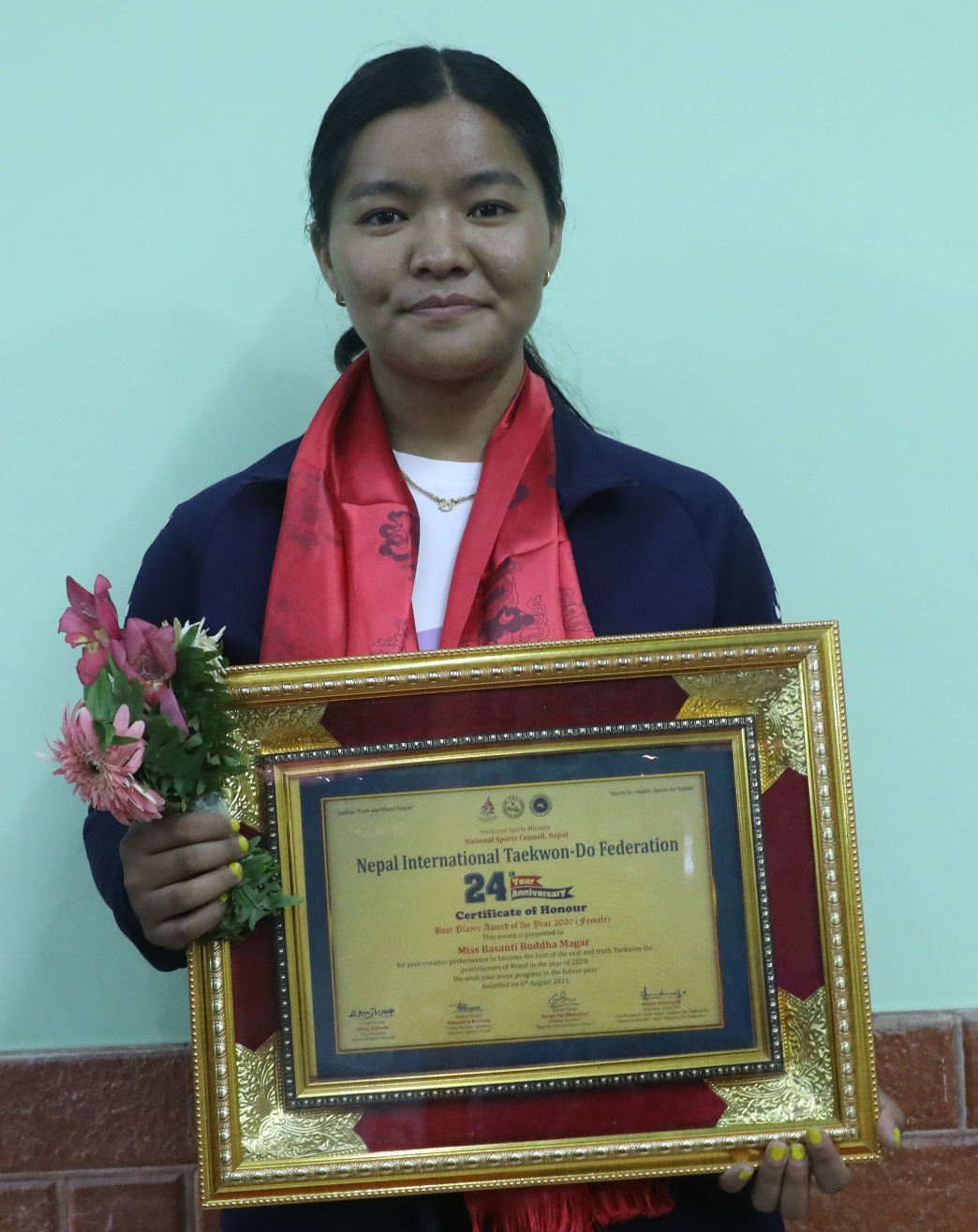 काठमाडौं (हाम्रो खेलकुद) – नेपाल अन्तर्राष्ट्रिय तेक्वान्दो महासंघ (एनआईटीएफ) ले पुरुषमा भीमबहादुर तामाङ र महिलामा बसन्ती बुढा मगरलाई वर्षको उत्कृष्ट खेलाडीको अवार्डबाट पुरस्कृत गरेको छ ।