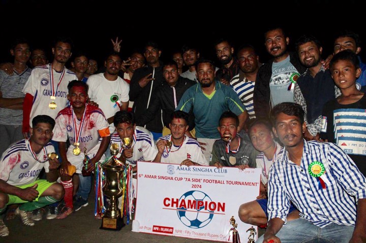 काठमाडौं (हाम्रो खेलकुद)– भैसेपाटी ट्याक्सी समाजले छैटौैं अमर सिंह कप सेभेन ए साइड फुटबल प्रतियोगिताको उपाधि जितेको छ । पार्टेस फुटबल क्लबलाई ३–१ ले हराउँदै भैसेपाटीले उपाधि जितेको हो । सोमतिर्थ खेल मैदानमा आज भएको फाइनलमा भैसपाटीलाई जित दिलाउन विशाल राईले २ तथा उत्तम भण्डारीले १ गोल गरे । पार्टेसका लागि एकमात्र गोल सविन केसीले […]