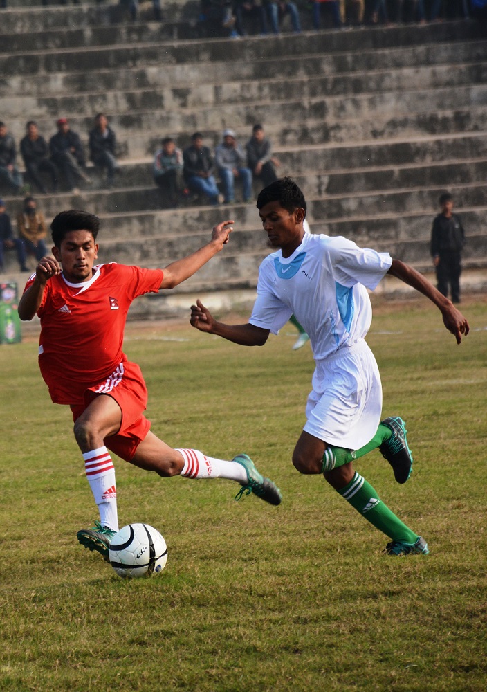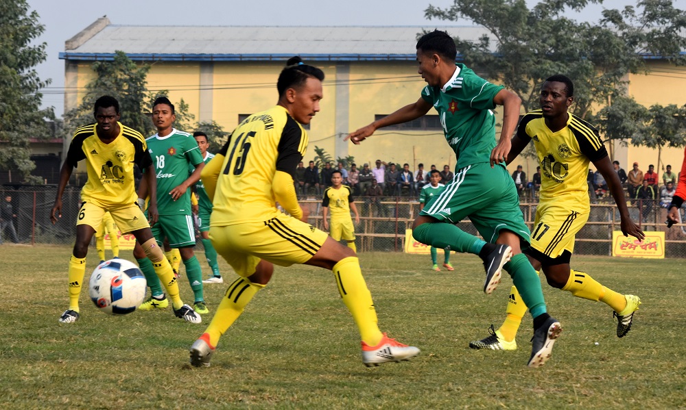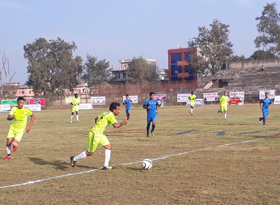 बेलबारी (हाम्रो खेलकुद)– त्रिभुवन आर्मी क्लब दोस्रो मनमोहन स्मृति दुहवी गोल्ड कप फुटबल प्रतियोगिताको फाइनलमा पुगेको छ । अग्नी रुपन्देही ११ लाई आज ४–० ले हराउँदै आर्मी उपाधि नजिक पुगेको हो । आर्मीले शनिबार हुने फाइनलमा अर्को ए डिभिजन टोली लक्ष्मी हुन्डाई मनाङ मस्र्याङ्दी को सामना गर्नेछ । तस्बिर सौजन्य : खनेन्द्र कुमार राई (अर्जुन)