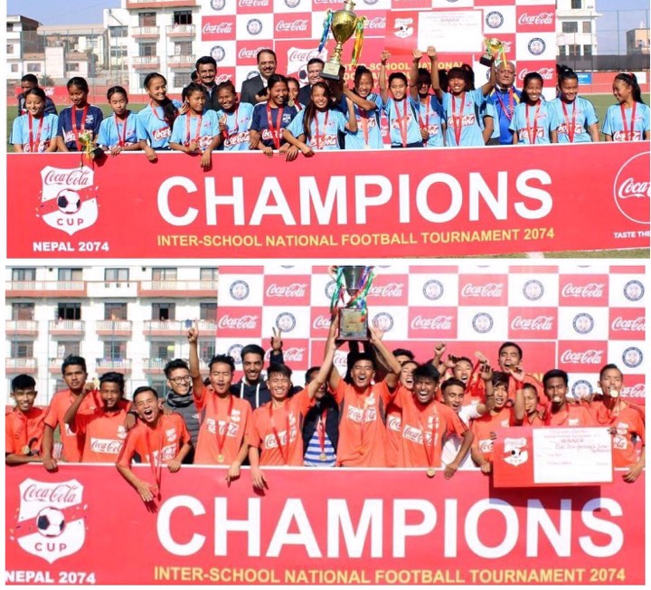 काठमाडौं (हाम्रो खेलकुद) – कोकाकोला कप अन्तर विद्यालय फुटबल प्रतियोगिताको उपाधि छात्रको बाल सिर्जनालय काडमाडौं र छात्राको दुर्गा देवी सेकेण्डरी स्कुल रौतहटले जितेको छन् । एन्फा कम्म्लेक्समा बिहीबार भएको फाइनल खेलमा एभरेष्ट स्कुललाई १–० ले हराउँदै सिर्जनालयले उपाधि जितेको हो । खेलको ७२ औं मिनेटमा आले मगरले गरेको गोल खेलको निर्णायक बनेको थियो । […]