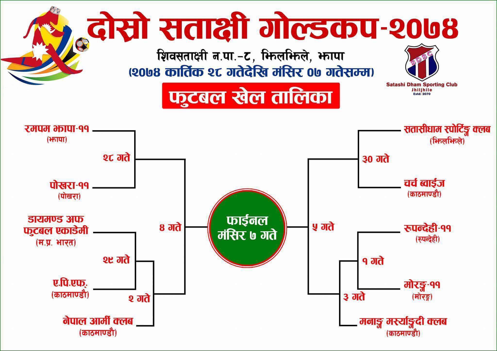 सबिन शेर्मा झापा – सताक्षी गोल्ड कप दोस्रो संस्करणको आज हुने उद्घाटन खेलमा रमपम झापा ११ र पोखरा ११ बीच प्रतिस्पर्धा हुनेछ । झापाको सितासिधाम स्पोर्टिङ क्लब झिलझिको आयोजना हुने प्रतियोगिता गणेशमान सिंह अध्ययन प्रतिष्ठानको खेल मैदानमा हुनेछ । मंसीर ७ गते सम्म चल्ने प्रतियोगितामा एक विदेशी क्लब सहित नेपालका ए डिभिजन र मोफसलका १० […]