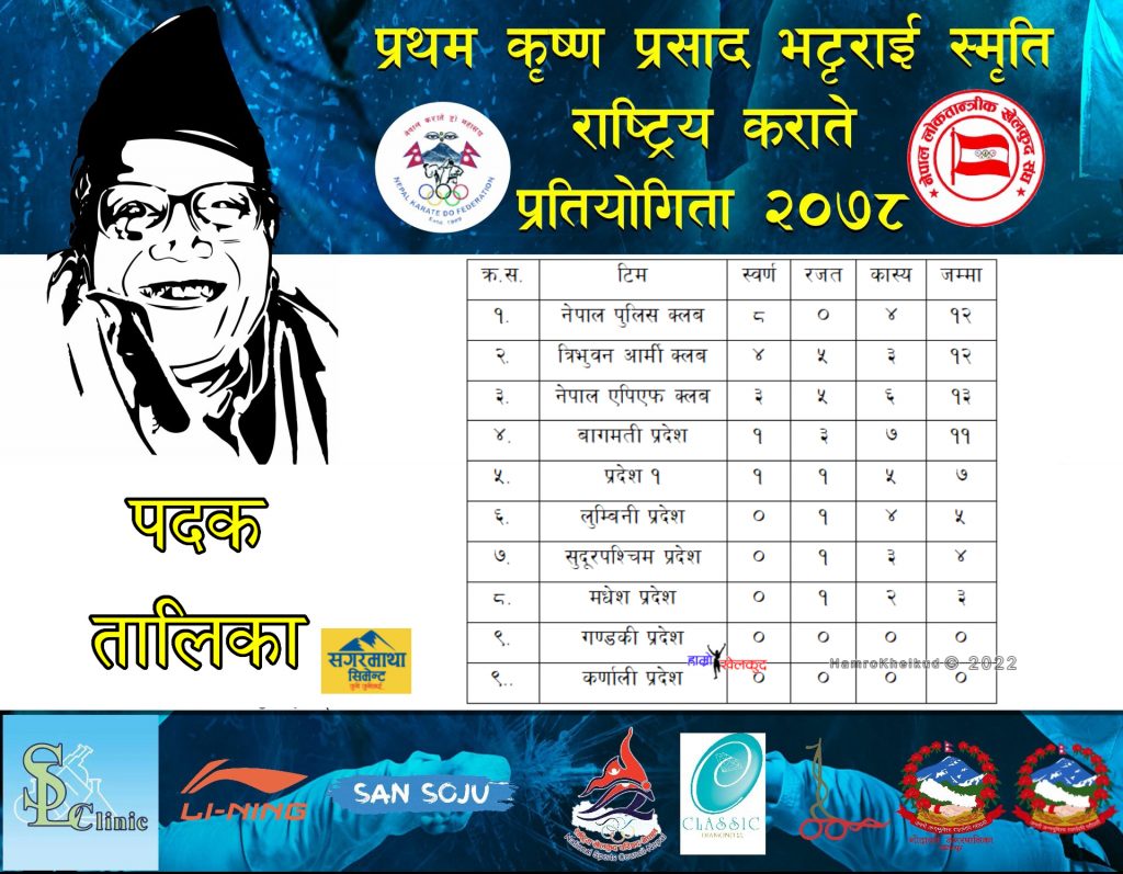 काठमाडौं (हाम्रो खेलकुद)– आठ स्वर्ण पदक सहित नेपाल पुलिस क्लब प्रथम कृष्णप्रसाद भट्टराई स्मृति राष्ट्रिय कराते प्रतियोगिताको टिम च्याम्पियन बनेको छ । पुलिसले ४ कास्य पदक जितेको छ । टिम च्याम्पियन बनेसँगै पुलिसले १ लाख रुपैयाँ प्राप्त गरेको छ । शनिबार सम्पन्न प्रतियोगितामा ४ स्वर्ण, ५ रजत र ३ कास्य पदकका साथ त्रिभुवन आर्मी क्लब दोस्रो हुँदा ३ स्वर्ण, ५ रजत र ६ कास्य पदकका साथ एपिएफ तेस्रो भएको छ ।