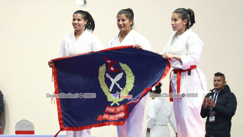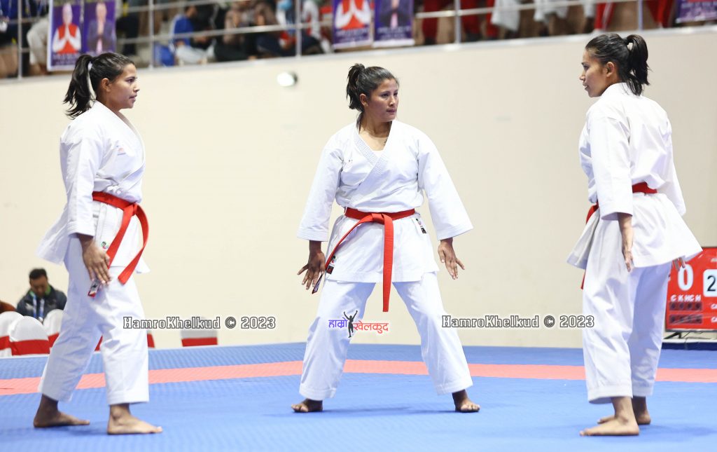 ललितपुर सातदोबाटोस्थित कराते एकेडेमीको हलमा बिहीबार सुरु भएको प्रतियोगिताको टिम काताको फाइनलमा त्रिभुवन आर्मी क्लबलाई हराउँदै पुलिसले स्वर्ण पदक जितेको हो । फाइनलमा पुलिसले २४.१६ अंक र आर्मीे २३.१६ अंक जोडेको थियो । एकलतर्फ स्वर्ण पदक जितेकी चन्चला दनुवारसहितको टोलीले टिम इभेन्टमा पहिलो स्थान प्राप्त गरेको थियो ।